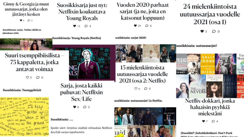 PS. Oma suosikkini vuonna 2021 julkaisemistani postauksista? Erään romanttisen komedian anatomiat, kaikki Viime aikojen suosikkiasioita –postaukset ja tämä höttöinen hömppäpostaus: Sarja- ja leffakohtauksia, joita ajattelen usein. Inhokkipostaukseni? Naistenpäiväkirjoitukseni Wait ’til you meet my little sister. Tarkoitin hyvää, mutta kirjoitus leviää käsiin eikä siinä ole päätä eikä häntää.