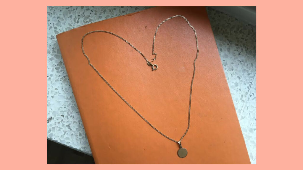 Kaulakorun toiselle puolelle on kaiverrettu nimikirjaimeni M, toiselle syntymäaikani. Perus kummilahja siis, mutta tunnearvo nostaa korun arvoa hurjasti omissa silmissäni. Jotenkin kai myös fiilistelen sitä ajatusta, että jos koskaan saisin lapsen, voisin antaa korun hänelle. Mulla on tallessa oman isäni mahdollisesti myös kastelahjana saama kaulakoru. Se on samanlainen kuin omani, mutta koristeltuna hänen nimikirjaimellaan.