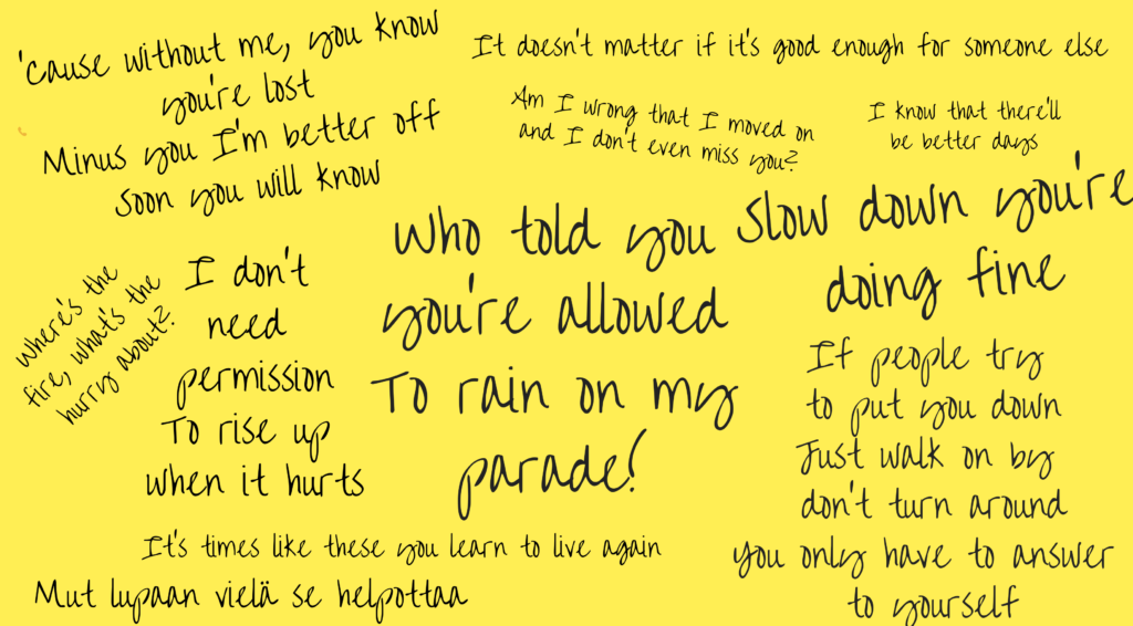 Tässä Pieni tsemppibiisilista eli 10+1 kappaletta, jotka ovat ilahduttaneet, inspiroineet ja naurattaneet minua tänä typeränä vuotena.